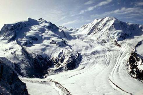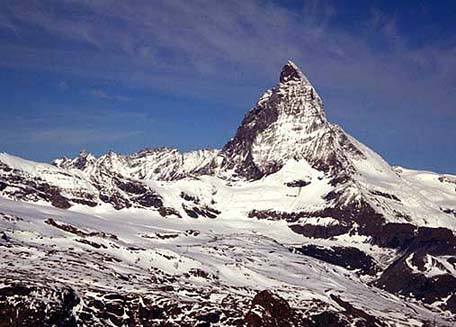 I took the cog railway back up to Cornergrat by flocks of Swiss sheep, and this time the top was glorious. I stood above the glaciers, flowing like rivers of ice below me, to look across to the Matterhorn and many other vistas of the Swiss Alps and the Zermatt valley. It was Heaven.