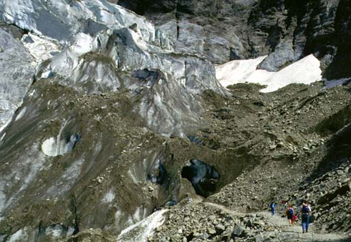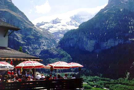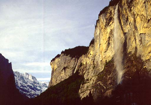 Well, to jump to the chase, up that valley was Staubach Falls, the highest waterfall in Switzerland (nearly 1000 ft high); another picturebook village: Lauterbrunnen; at least two other waterfalls nearly 1000 ft high, one of which had cut its way completely _into_ the mountainside; all in a glacial valley comparable to Yosemite, but without the crowds. I had no difficulty finding a nice hotel there, and had dinner on a patio overlooking the falls.