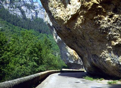 My route took me through the Gorge du Tarn, the Grand Canyon of France, famous around the time of this writing for being spanned by a new high tech bridge, but then requiring a circuitous descent and climb on tightly winding roads. Actually, my intent was to descend into the canyon and then drive out to the end, but when I got to the bottom I found the road closed due to construction. I successfully communicated with the bartender in a little place in the village and learned that the road was open farther down, but I would have to climb up to the southern rim and then back down again. This route did have the advantage of taking me to a vista of a bend in the river that had attracted my attention in the guide books in the first place.