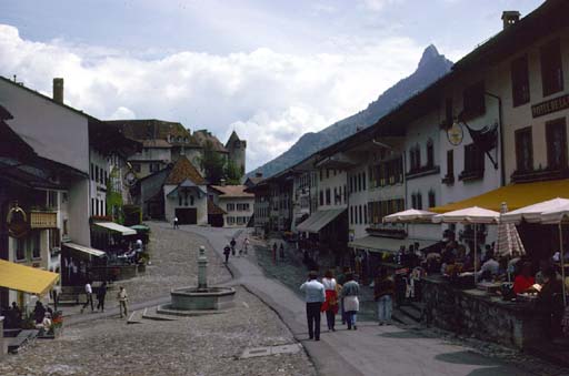 The next day I finally did continue on toward Geneva, stopping to visit the self-consciously picturesque village of Gruyere alone the way. Gruyere is very nice: it's small and the center of town is a wide pedestrian only "street". I had lunch in yet another outdoor cafe with studiously incompetent matronly waitresses. It had turned hot again, and I watched as my waitress brought out my coke and set it down not 10 feet from while she went off doing other things! Oh well.