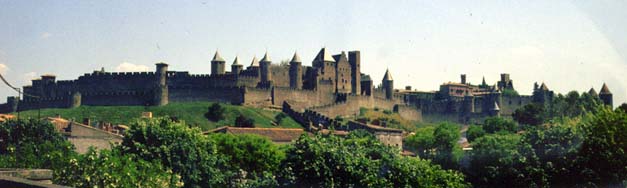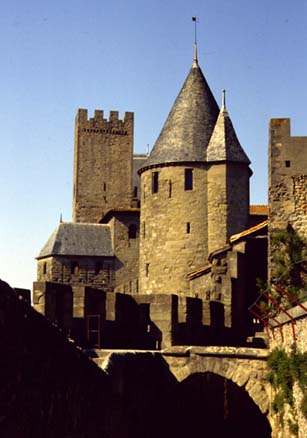 I could see and hear a small restaurant across the narrow street from my room on the second floor, and, when I was sufficiently rested, I went down for dinner. The menu showed "lamb cassoulet", a dish I very much wanted to try, so I sat down and ordered that plus my standard coke with ice, only to be told "pas glacons, messieur". I left without the lamb cassoulet and still haven't had the dish to this day, but I can't kick myself too hard - I really needed that ice! I had a fair sausage platter in another restaurant and looked around the town in the evening. Carcassonne is a living city with permanent residents, schools, and a cathedral, as well as shops and restaurants, and is one of the great walled towns of Europe. I also dropped by the hotel that Mother and I stayed in in 1980 which is in the walls and looks over the new town. It has become fancier and would have been too expensive even if I had been able to get to it before fainting! I hope to visit again someday.