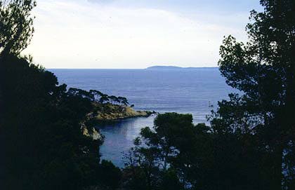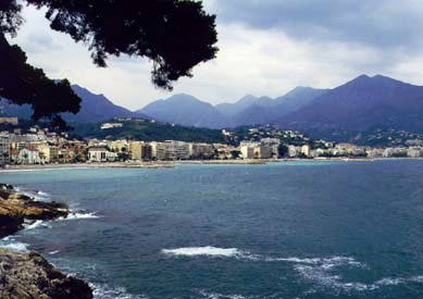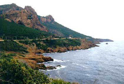 The next day I continued along the Riviera, the rain definitely in evidence. It was around about here that I definitely started to get depressed about the possibility that I wouldn't be able to see the Matterhorn, and that I had screwed up the trip. The Riviera is now fully developed along its entire length at least from le Lavendou to Menton at the Italian border, and that was depressing as well. The only remaining open country, and it's not much, was the park at Massif de l'Esterel , a rock formation that comes down to the sea along the way. I skipped Nice and Monaco this trip, although I did see both of those places back in 1980.