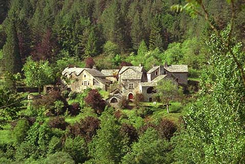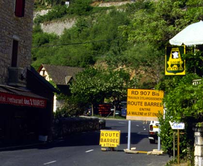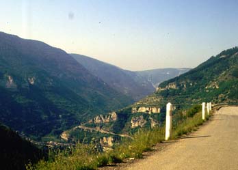 My route took me through the Gorge du Tarn, the Grand Canyon of France, famous around the time of this writing for being spanned by a new high tech bridge, but then requiring a circuitous descent and climb on tightly winding roads. Actually, my intent was to descend into the canyon and then drive out to the end, but when I got to the bottom I found the road closed due to construction. I successfully communicated with the bartender in a little place in the village and learned that the road was open farther down, but I would have to climb up to the southern rim and then back down again. This route did have the advantage of taking me to a vista of a bend in the river that had attracted my attention in the guide books in the first place.