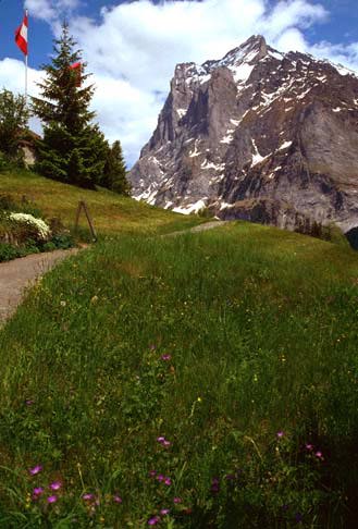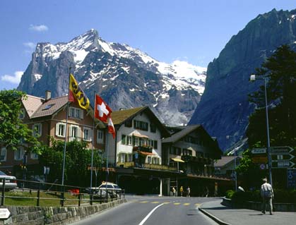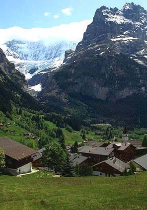 Grindelwald is at the foot of the Eiger, the mountain made famous in the book "The Eiger Sanction" by Trevanian, and the movie of the same name starring Clint Eastwood. In addition, the Jungfrau range (the Jungfrau is the highest mountain in Switzerland) is visible from the valley. Also in the valley is the Wetterhorn and the Wetterhorn Glacier, about which more later.