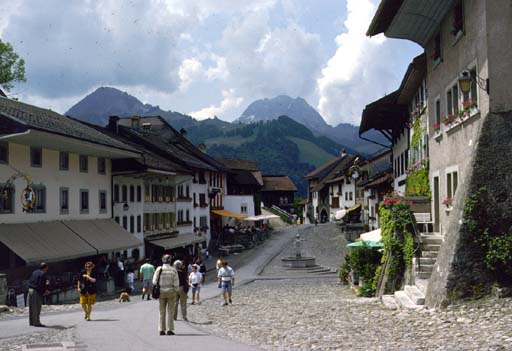 The next day I finally did continue on toward Geneva, stopping to visit the self-consciously picturesque village of Gruyere alone the way. Gruyere is very nice: it's small and the center of town is a wide pedestrian only "street". I had lunch in yet another outdoor cafe with studiously incompetent matronly waitresses. It had turned hot again, and I watched as my waitress brought out my coke and set it down not 10 feet from while she went off doing other things! Oh well.