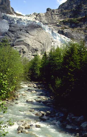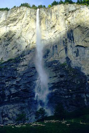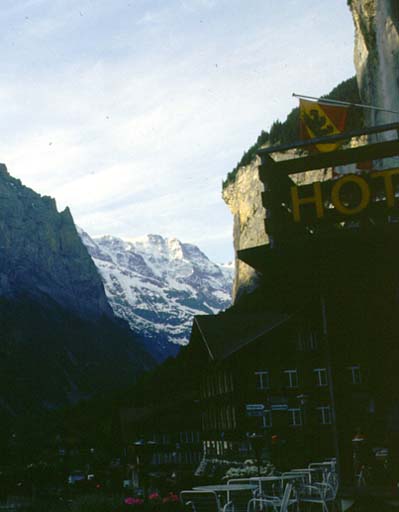 Well, to jump to the chase, up that valley was Staubach Falls, the highest waterfall in Switzerland (nearly 1000 ft high); another picturebook village: Lauterbrunnen; at least two other waterfalls nearly 1000 ft high, one of which had cut its way completely _into_ the mountainside; all in a glacial valley comparable to Yosemite, but without the crowds. I had no difficulty finding a nice hotel there, and had dinner on a patio overlooking the falls.