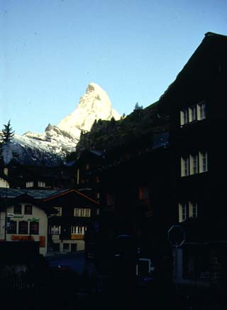 After a poor night's sleep, I got up early and rushed out in the desperate hope that it might have cleared up. The sky was such a light blue I wasn't sure whether it was clear or overcast, until I saw the Moon! I nearly ran to the town square and looked up, and there it was - the Matterhorn in all its glory. And thus began my best day ever on a trip.