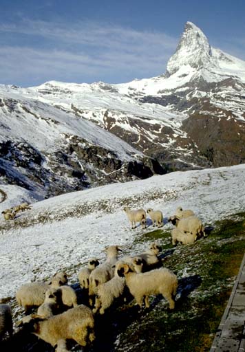 I took the cog railway back up to Cornergrat by flocks of Swiss sheep, and this time the top was glorious. I stood above the glaciers, flowing like rivers of ice below me, to look across to the Matterhorn and many other vistas of the Swiss Alps and the Zermatt valley. It was Heaven.