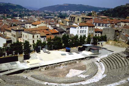The next day, I continued on toward my next stop, Le Puy in central France. If anything the day was hotter as I approached my first stop in Vienne, a very old town with the ruins of a Roman temple and amphitheater, as well as an archeological dig. Vienne is not too big and I was able to park fairly near the center of town, which is situated on a hillside above a river. First I visited the temple, a small classic structure which is a twin of one in Nimes that we had caught a glimpse of in 1980 (see that story). I had started up the hill toward the theater when I spotted a very modest snack bar with outdoor seating. Since it was about lunch time I went in to find two cute French girls behind the counter waiting to take my order. I asked for a hot dog and a coke (I had a lot of cokes on this trip) with "glacons" (ice cubes). After a short wait they produced a tray with the coke and a hot dog in a hollowed out mini-baguette. I paid and took the tray outside.