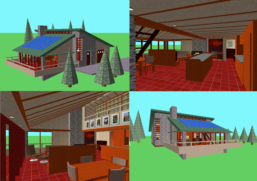 Following are some interior and exterior views, and the floorplan. I welcome comments on the concept plus any reasonable suggestions. In addition, I will entertain offers for engineering and drafting support if any professionals are interested. My e-mail address is at the bottom of the page.