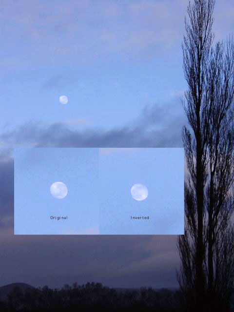 Friends reminded me to see if the Moon was upside down as seen from down under. Here's proof. In the inset, on the left, is the Moon as seen in the larger picture. On the right is the image rotated 180 degrees. The familiar "Man in the Moon" is visible.