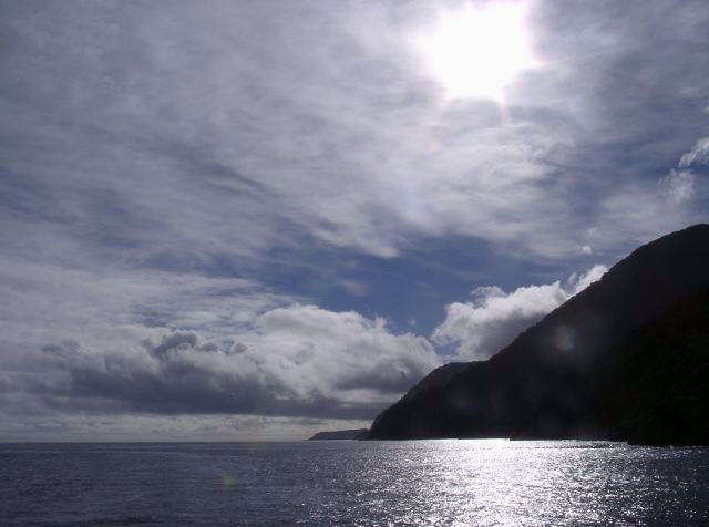 Northern Sun. The cruise goes out to the Tasman Sea. The Captain said that the point of land in the distance was directly north. This picture, taken near Noon, local time, shows how the Sun is seen in the north in the Southern Hemisphere.